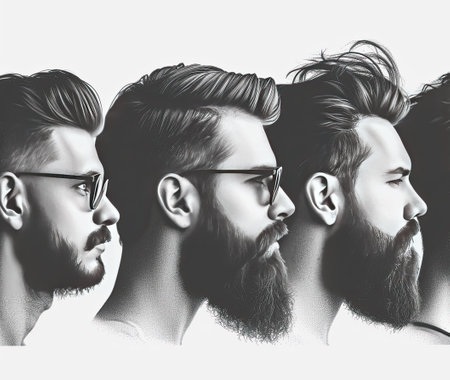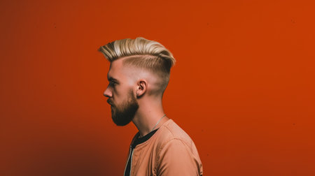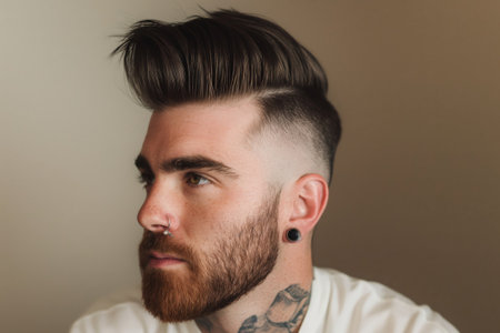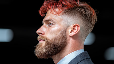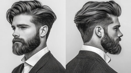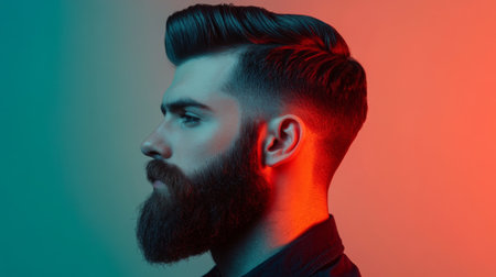 A profile shot of a man with a slicked-back pompadour hairstyle, with his beard neatly trimmed, exuding a classic yet stylish look.