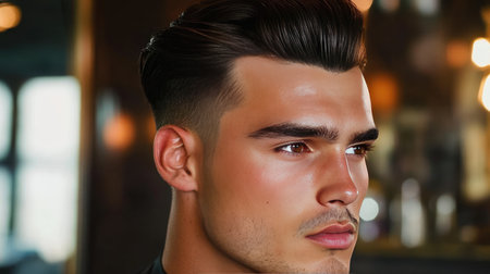A young man with a modern fade haircut displays sharp features in this barbershop close-up, showcasing a trendy and confident look in a stylish urban setting.