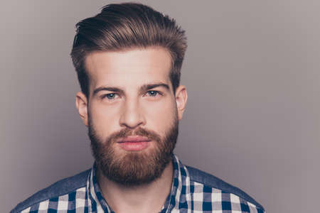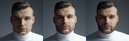 Bearded man set. Long beard. Hair style hair stylist. Barber shop set. Collage of mans face portrait. Handsome man after or before shaven on grey background.