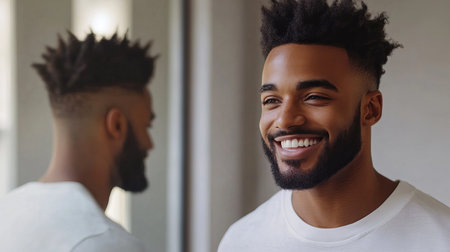 A joyful man admires his stylish reflection in the mirror, showcasing confidence and happiness. The bright setting enhances his smile, capturing a moment of self-appreciation and positivity.