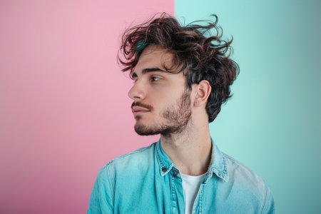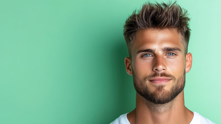 A young man exuding confidence with wavy hair and a beard, captured in a serene close-up. Ideal for fashion, lifestyle, or beauty contexts, evoking modern aesthetics.