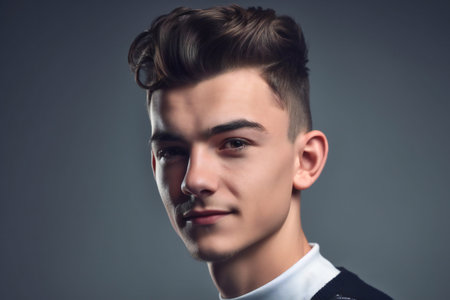 Young caucasian male with stylish pompadour hairstyle against gray background