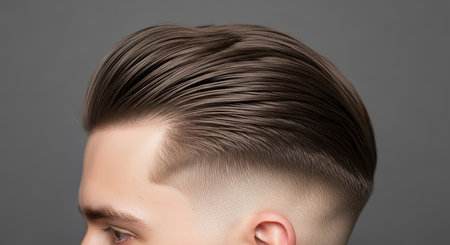 A close-up of a man with a slick pompadour and a low fade, perfect for a vintage-inspired look