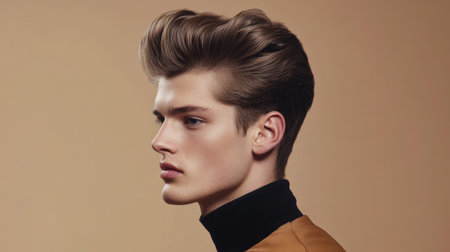 A young man with a classic pompadour hairstyle, styled with volume and sleekness, set against a neutral background to highlight the elegant design.