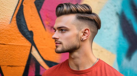 A man with a modern, sleek hairstyle standing in front of a colorful mural, his hair adding to his artistic vibe.