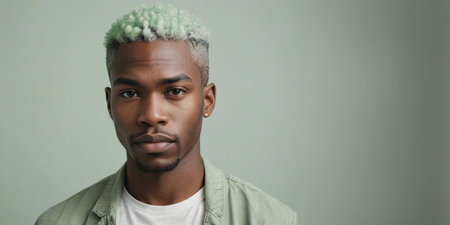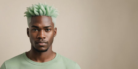 Photo Of A Infuriated African American Male Model With A Light Green Hair Isolated On A Flat Blurred Ivory Background With Copy Space, Banner Template. Generative AI