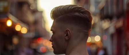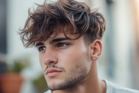 A stylish portrait of a young man showcasing his trendy hairstyle. The closeup captures thoughtful emotions and a serene vibe in a contemporary setting.