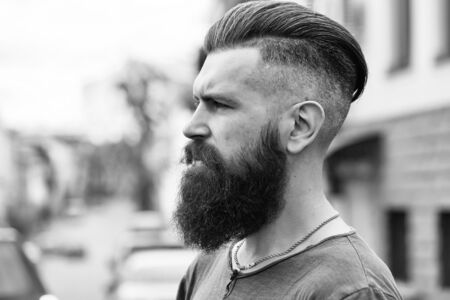 Handsome young stylish hipster man with long beard in grey shirt standing outdoor