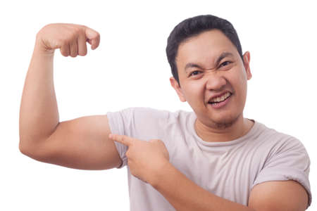 Portrait of funny attractive young narcissist Asian man smiling happily while showing his small arm, biceps arm muscle posing, feeling strong concept