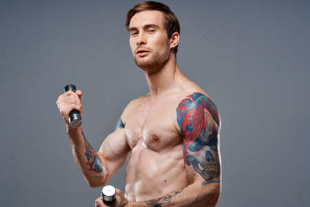 sexy athlete with pumped up arm muscles and health vitamins dumbbells model
