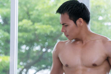 Muscular young man standing near windows with tree nature background. Athletic handsome male bodybuilder strong posing front window. Perfect body concept.