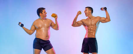 You are what you eat. Fat guy change a burger for an apple at an athlete. Awesome Before and After Weight Loss fitness Transformation. The man was fat but became athlet. Fat to fit concept.