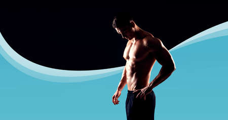 Shirtless male torso over dark background. Shape male abdomen muscles.