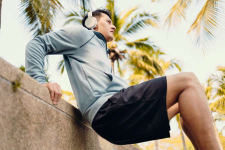 Portrait of young athletic asian man in an active sportswear on the running sidewalk in the greenery garden. Sport concept