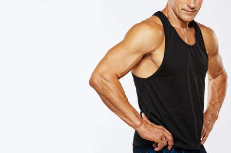 handsome man in white t-shirt on black background inflated arm muscles sport model cropped view Copy Space