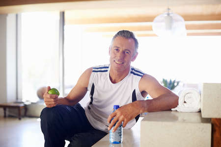 Hes never been in better shape. A handsome mature man relaxing at home with an apple and a water bottle.