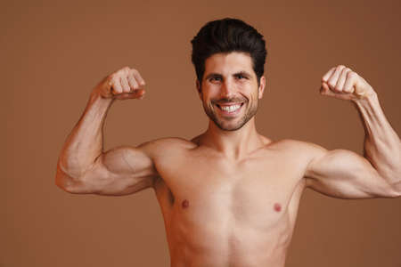 Shirtless happy man smiling and showing his biceps at camera isolated over beige background