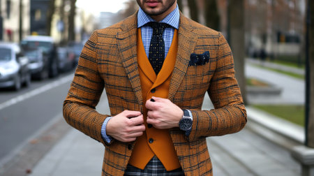 A fashionable man dressed in a tailored brown checkered suit is captured adjusting his outfit on a city street. The blurred background features parked cars and trees, enhancing the urban vibe of this stylish scene.