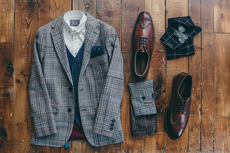 Elegant Suit, Tie, and Shoes on Wooden Floor, A chic and polished ensemble that showcases attention to detail, from perfectly pressed trousers to a well-tailored blazer