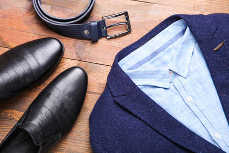 Classic blue men's costume with black leather shoes and a belt on brown background. Men's clothing.