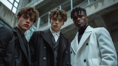 Fashionable young men in black coats posing in an urban context