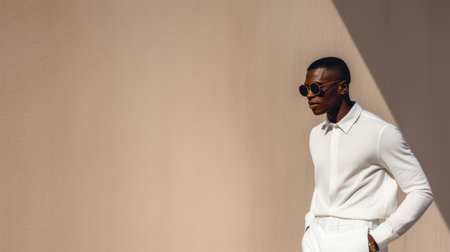 African american man in sunglasses looking away while standing against beige wall