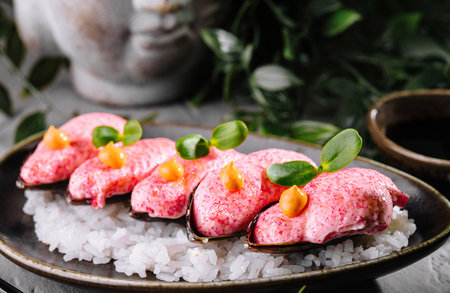 Exquisite lobster sushi adorned with caviar and green leaves, presented on a ceramic plate