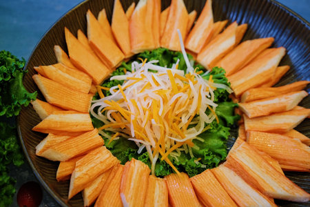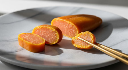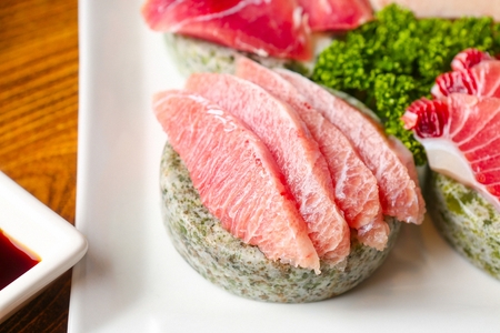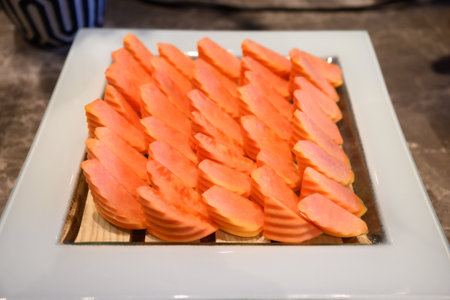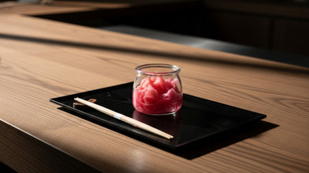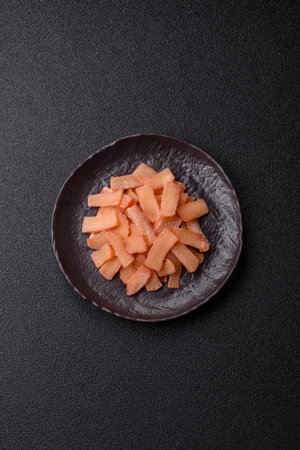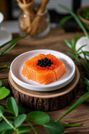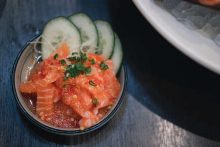 Captivating Visuals: Embracing the Natural Light and Shadows of Exquisite Raw Salmon Dish Served in a Japanese Restaurant - A Wholesome Culinary Delight with an Asian Twist!