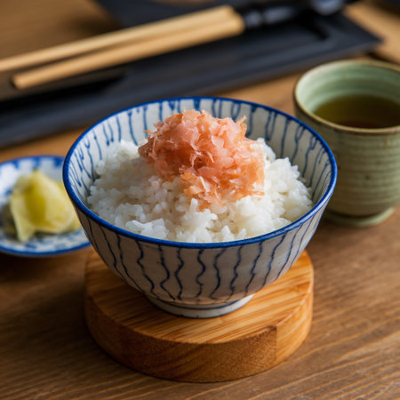 A bowl of rice topped with bonito flakes, accompanied by green tea and pickled ginger.