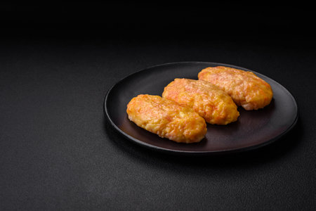 Delicious steam cutlets with carrots, cheese, salt and spices on a dark concrete background