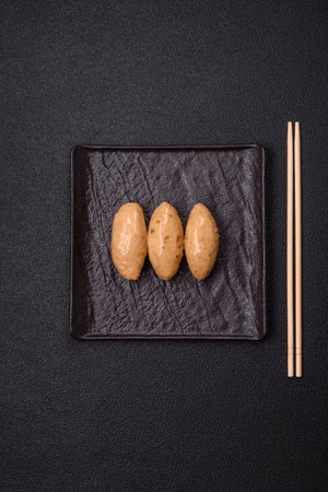 The aesthetics of Japanese cuisine. Sushi. Rice with vinegar seasoning. Various seafood. Delicottes. Tasty food. Seasonings and spices. Sashimi Rolls Ramen Poke.
