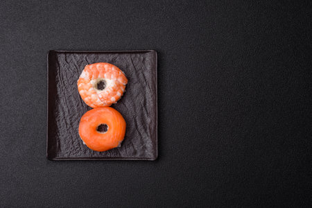 Donut shaped sushi rolls with salmon, shrimp and tuna on dark concrete background
