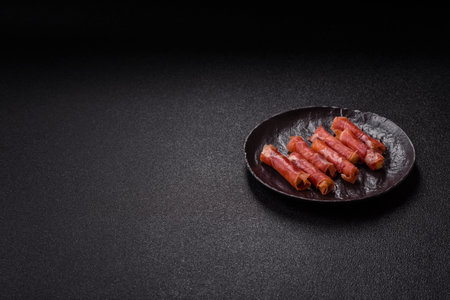 Cheese and meat, jamon or prosciutto rolled into a roll. Antipasti or delicacies for the festive table