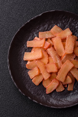 Food, dried squid in shavings or chopped as snacks or jerky. Snack dried squid for beer, background for your design