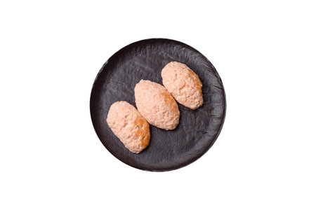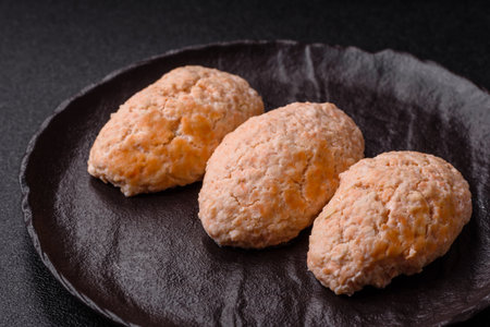Steamed fish or chicken cutlets or meatballs with salt and spices. Fish cutlets made of chopped salmon