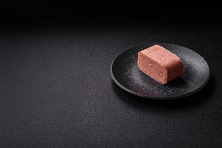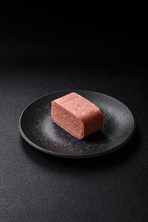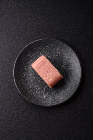 Delicious canned pink ham with salt, spices and herbs on a dark concrete background