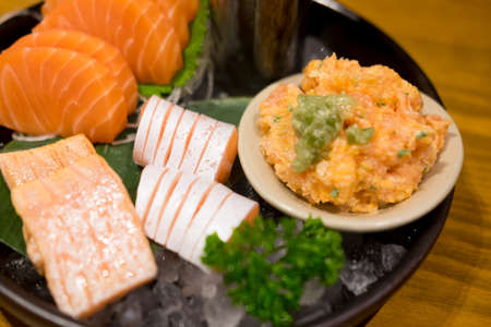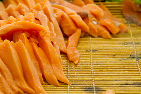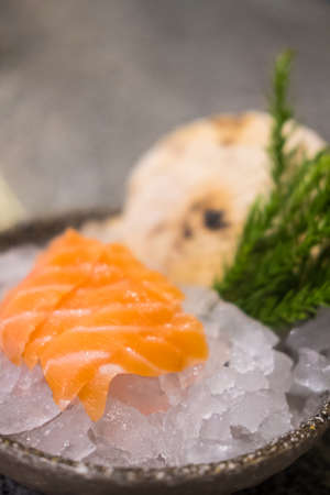Salmon sashimi cutting fresh and raw piece in Japanese food style.