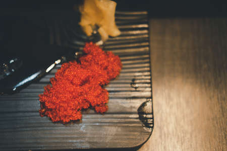 Tobiko flying fish roe served on side dish in sushi tray : Japanese sushi ingredient