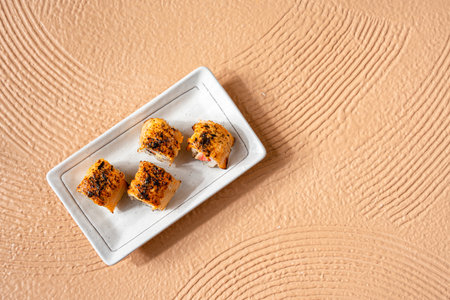 Discover an enticing plate of sushi bites, beautifully garnished with fresh herbs and sesame seeds, perfect for gatherings or culinary adventures.