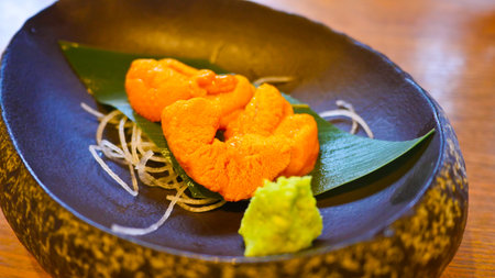 closeup shot of delicious raw sea urchin with rich buttery texture served in a bowl