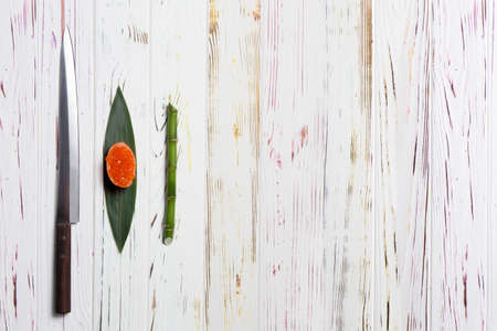 Gunkan Sake sushi with salmon caviar eggs and rice wrapped in salmon fillet, served on bamboo leaf near bamboo plant stick. Pan Asian traditional restaurant meal, white wooden board. Background image