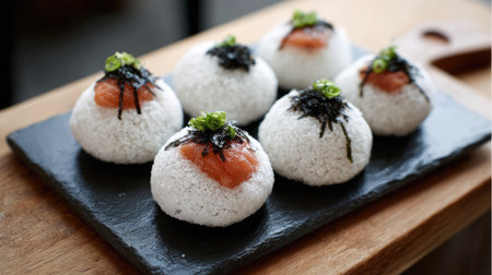 A captivating arrangement of sushi rice balls topped with fresh salmon and seaweed on a slate plate. Perfect for showcasing culinary artistry.