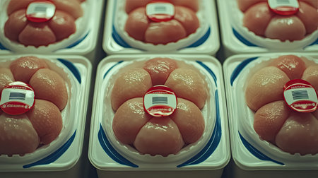 A visually striking array of fresh raw chicken breasts presented in plastic containers. Ideal for grocery stores or culinary displays, highlighting freshness and quality.