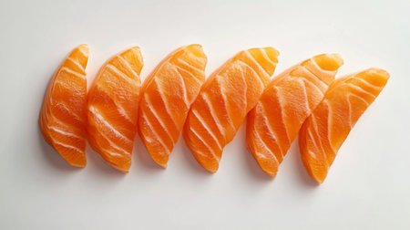 Detailed shot of salmon belly slices with a rich, fatty texture, set against a white background to emphasize the quality and freshness of the cut.