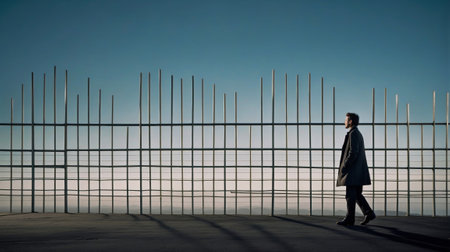 Businessman walking in a city with a fence in the background.