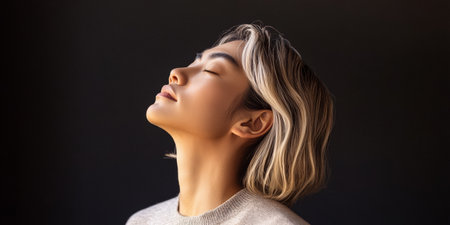 A young woman closes her eyes and tilts her head back, taking a deep breath in a serene and dark environment. She appears peaceful and lost in thought, embodying calmness and introspection.