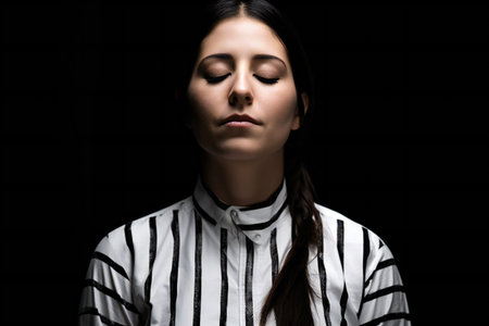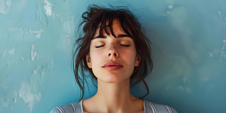 Serene Young Woman with Closed Eyes in Peaceful Pose Against Dark Background.
