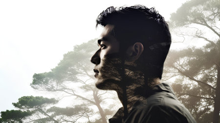Double exposure portrait of a young man in the forest. Conceptual image.