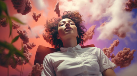 A woman is lying in a chair with clouds above her, AI