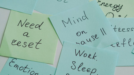 Colorful sticky notes with handwritten reminders about emotional burnout and self-care tips